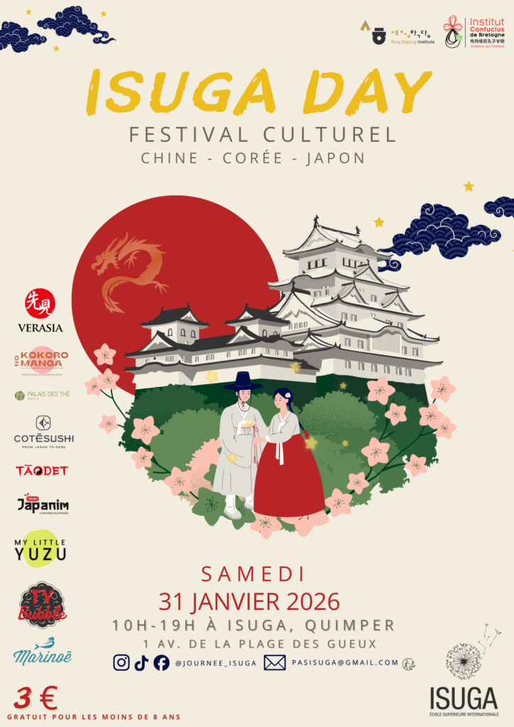 Le samedi 31 janvier 2026, le campus d’ISUGA à Quimper ouvre ses portes pour une journée exceptionnelle dédiée aux cultures asiatiques : l’ISUGA Day. De 10h à 19h, petits et grands sont invités à découvrir le Japon, la Corée et la Chine à travers un programme riche en animations, ateliers et spectacles.